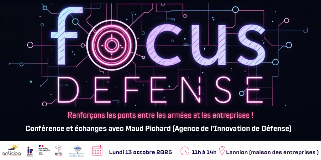 Nous avons le plaisir de vous inviter à la deuxième session de notre cycle « Focus Défense », animée par Madame Maud Pichard, représentante de l’Agence de l’Innovation de Défense (AID), qui se tiendra le lundi 13 octobre 2025 de 11h à 14h à la Maison des Entreprises de Lannion.