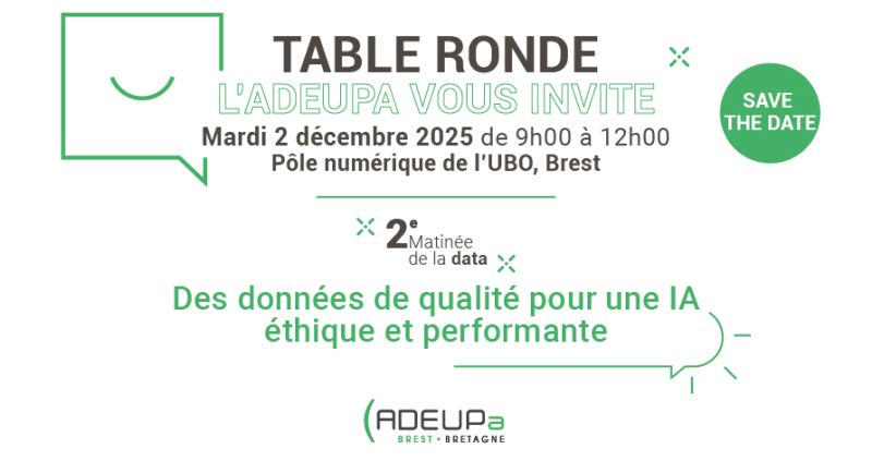 L’Adeupa vous invite à participer le 2 décembre 2025 à Brest à sa 2e Matinée de la data, un temps d’échange et de réflexion centré sur les défis majeurs liés à la qualité des données et à leur utilisation dans le déploiement d’une intelligence artificielle éthique, responsable et souveraine.