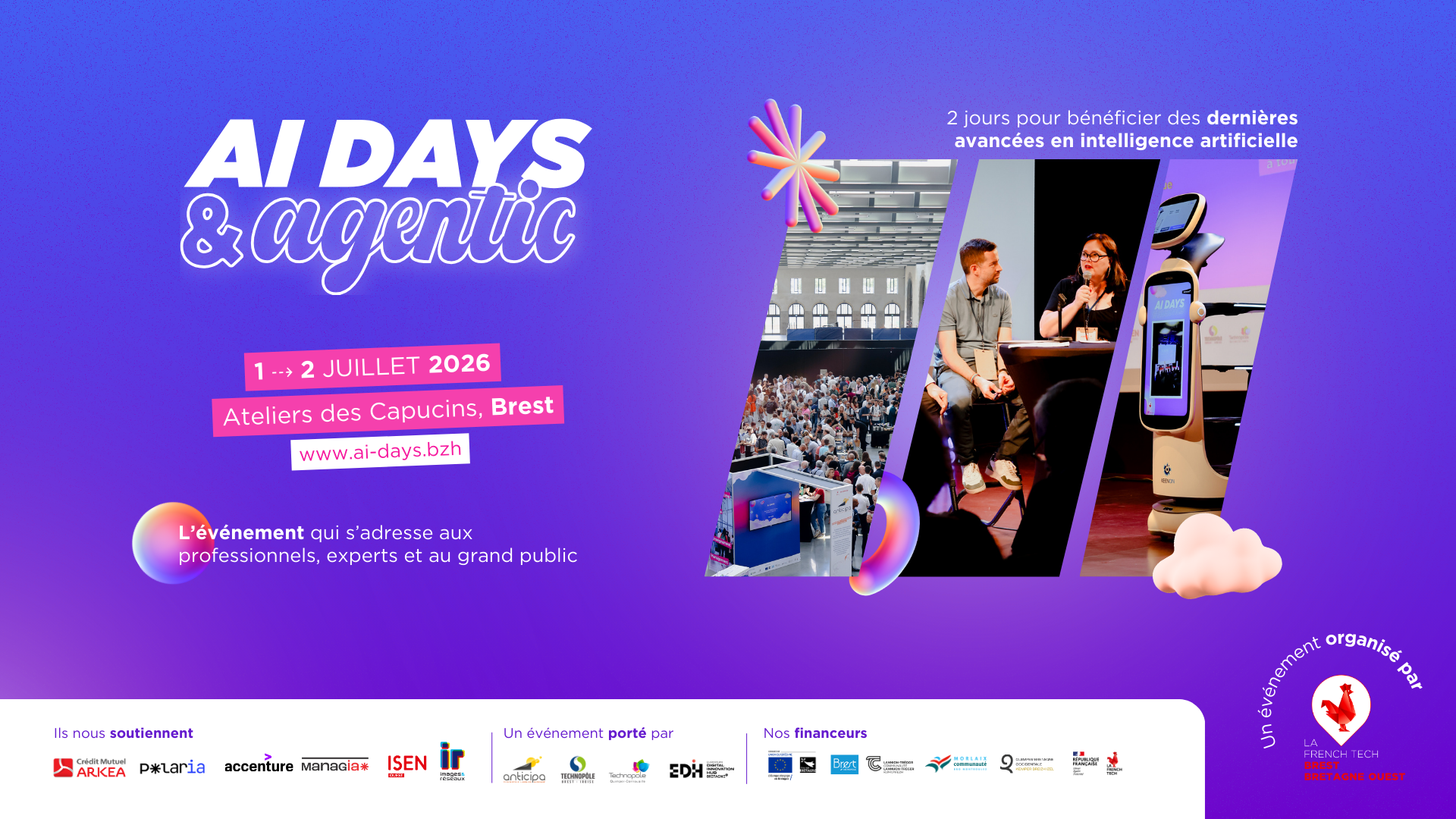 Les AI DAYS reviennent en 2026, on vous donne rdv les 1er & 2 juillet 2026 aux Ateliers des Capucins à Brest pour traiter du sujet de l’intelligence artificielle au travers de tables rondes, découvrir des retours d’expériences d’entreprises du territoire, rencontrer des startups locales, bénéficier de diags pour enclencher votre démarche IA.